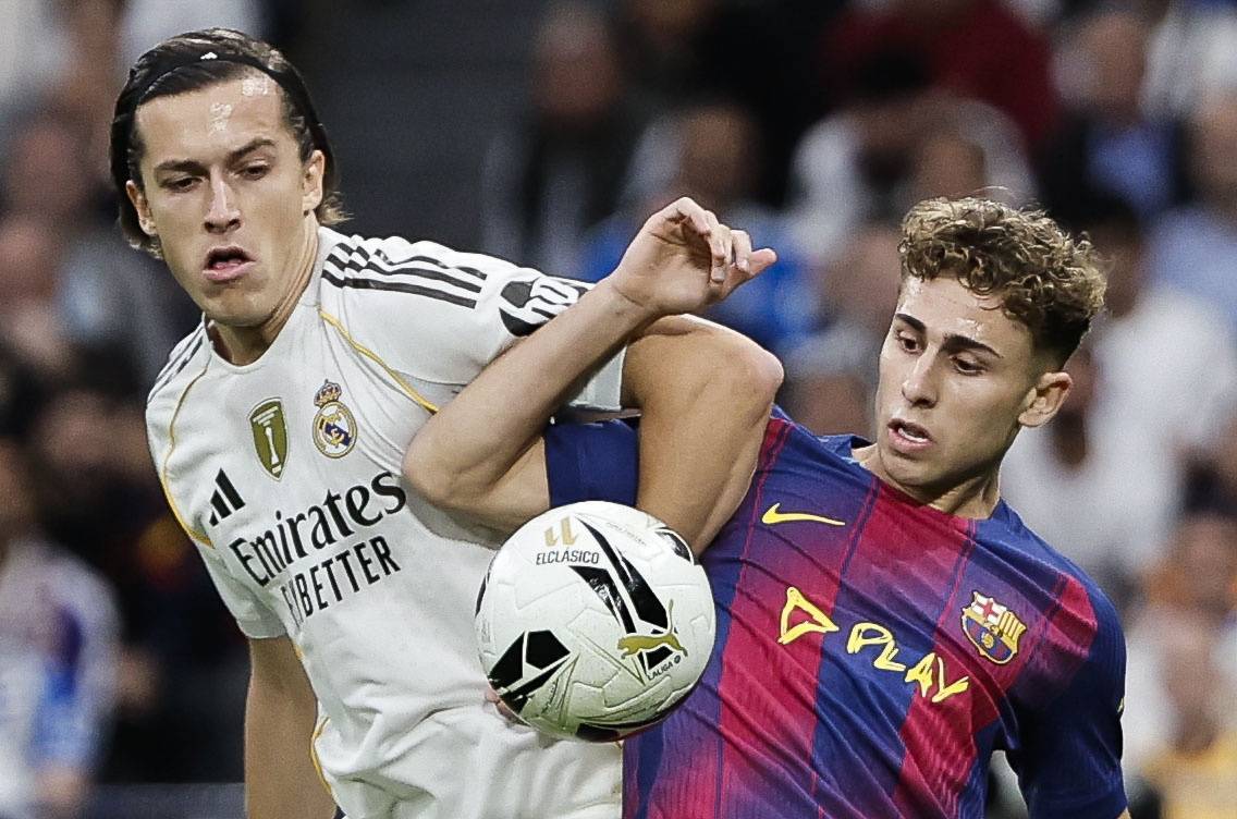 10月26日,皇家马德里队球员巴尔韦德(左)与巴塞罗那队球员佩德里拼抢。 新华社/欧新